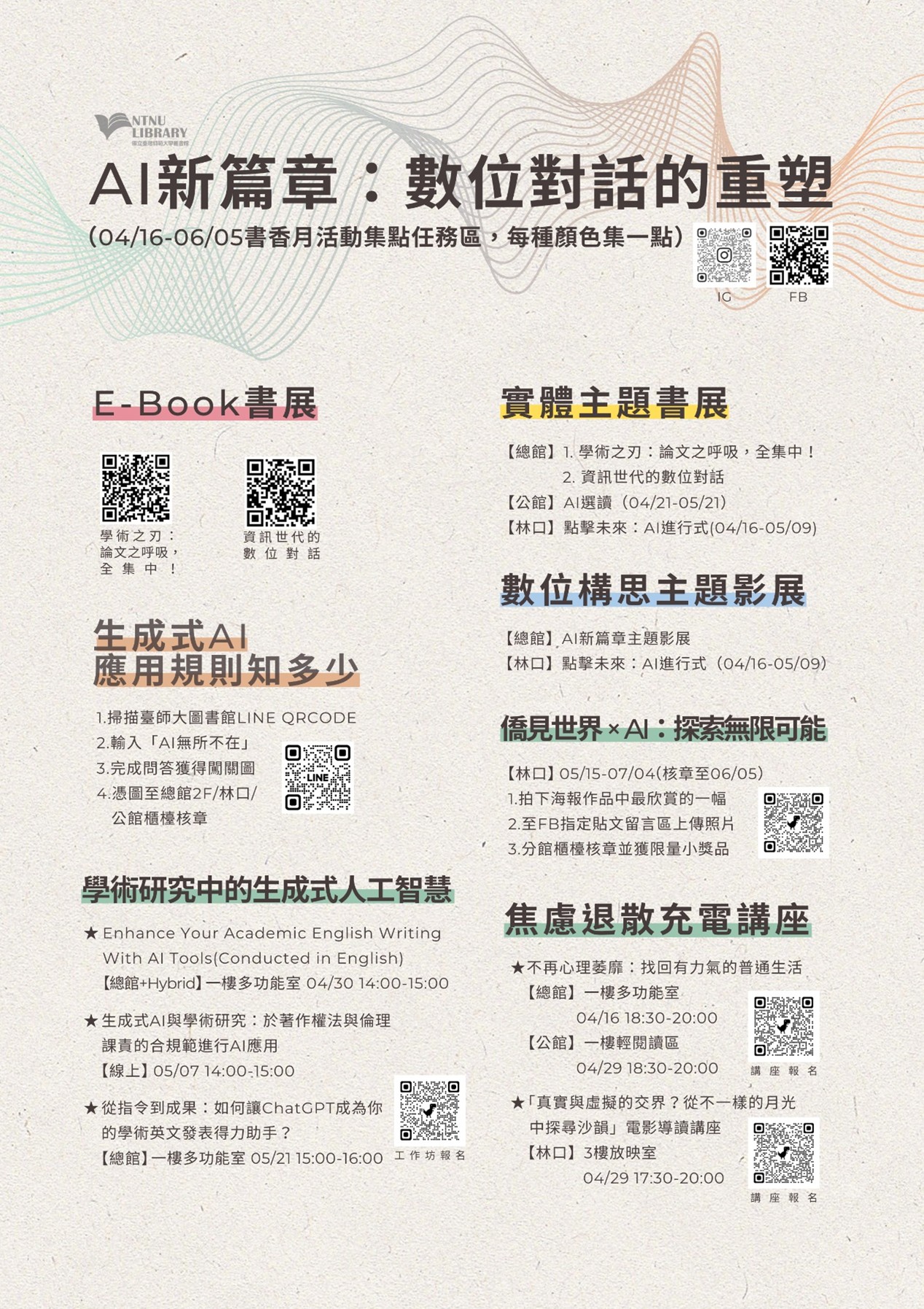 | 內 容 | 隨著生成式AI的問世,生活、工作、學習,甚至創作方面都產生了深刻變化。從初期的驚訝與探索,到現在普遍使用,生成式AI已不再是科幻情節,而是當下的工具。2025書香月精心策劃了《AI新篇章:數位對話的重塑》活動,希望對生成式AI類工具應用層面有更廣泛的介紹。期間透過電子書展、實體書展、影展,呈現生成式AI在數據方面的分析與應用、學術領域的使用及未來發展。順應而生的是在資訊爆炸世代,如何緩解緩解焦慮的講座。並設計生成式AI Q&A環節,使讀者亦可了解此類工具之規範和限制。 無論是對AI應用充滿好奇,還是已能靈活使用此類工具,都歡迎線上與實體參與活動,開啟這場智慧與創意的對話之旅! 時間:2025年4月16日(三)-6月5日(四) ★完成集點卡三點換二手盲書乙本(限量)或小禮品;二手盲書可能有破損、污漬,較介意者請選其他小禮品。