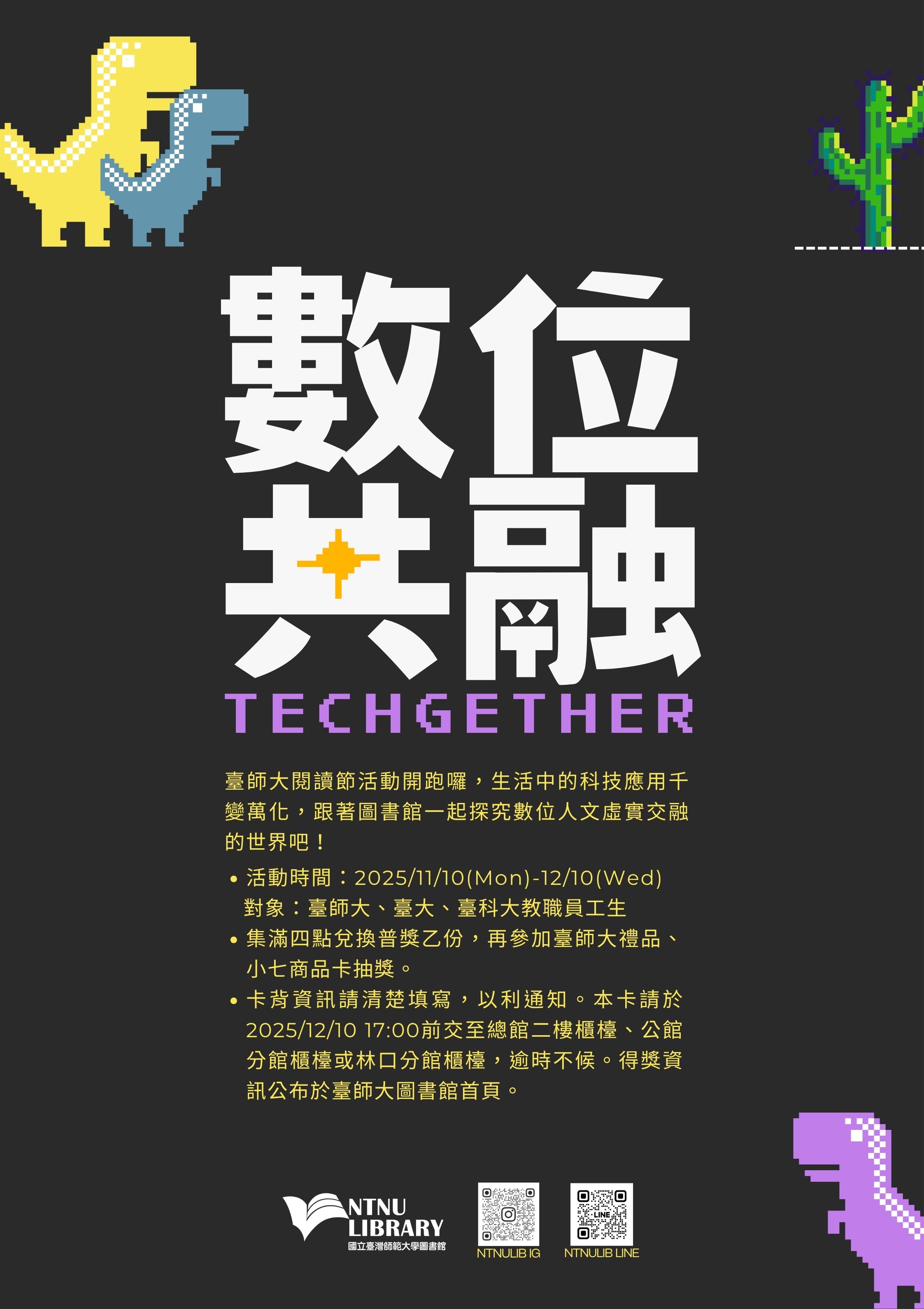 臺師大閱讀節活動開跑囉,生活中的科技應用千變萬化,跟著圖書館一起探究數位人文虛實交融的世界吧!